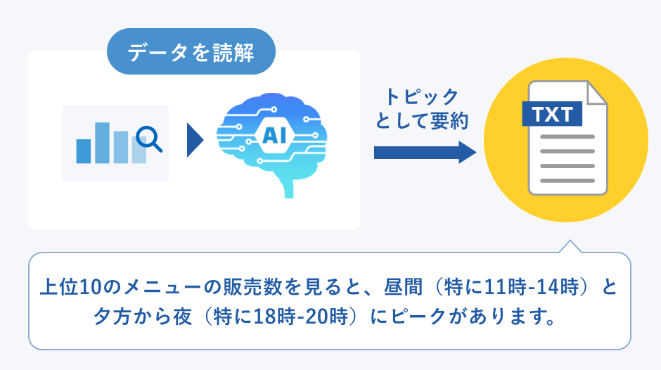 AIがデータを分析し、そこから読み取れる事柄を抽出して文章化します。店舗で何が起きているのか、経営上、注視すべきことはないか、人間がデータを見ているだけでは気づきにくい事象をトピックとして要約してくれます。