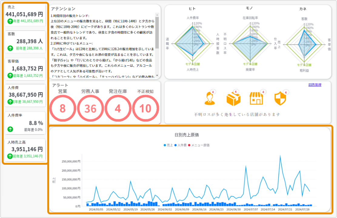 勤務者の人数や労働時間、発注量や廃棄量、売上額や粗利率といったデータの中から、AIが異常値を検出。勤怠情報の訂正、POSの取消し、現金の過不足など、不正リスクが潜む可能性のある箇所も予測して指摘してくれます。