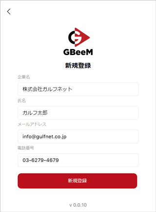 GBeeMアプリを起動すると、利用開始画面が表示されるので、「新規登録」をクリックします。御社名、お名前、メールアドレス、電話番号を入力し、「新規登録」をクリックします。