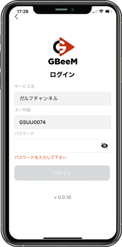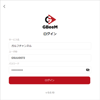 GBeeMアプリの利用開始画面で「ログイン情報の入力」をクリックし、ユーザIDとパスワードを入力して、「ログイン」をクリックします。