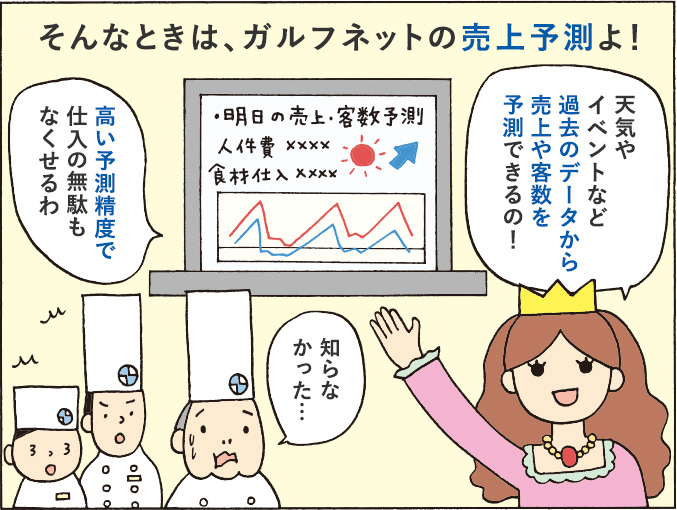 ガルフネットの売上予測は過去の天気やイベントなど過去のデータから売上や客数の予測ができるのよ!
