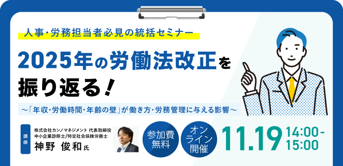 - テーマ :2025年の労働法改正を振り返る人事・労務担当者必見の総括セミナー