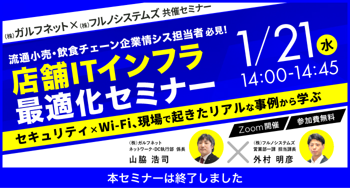 【1/21 オンライン開催】 ガルフネット×フルノシステムズ共催「店舗ITインフラ最適化セミナー」のお知らせ<終了しました>